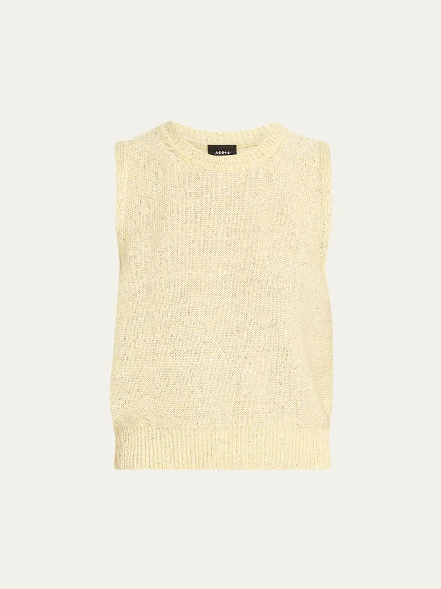Akris knit sweater embellished with shimmering micro sequins Crew neckline Sleeveless Ribbed hem Hip length Relaxed fit Pullover style Linen/polyester/cotton Made in Romania