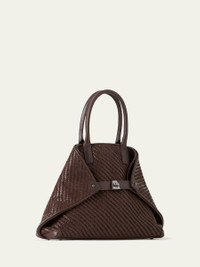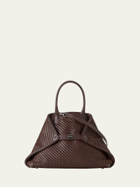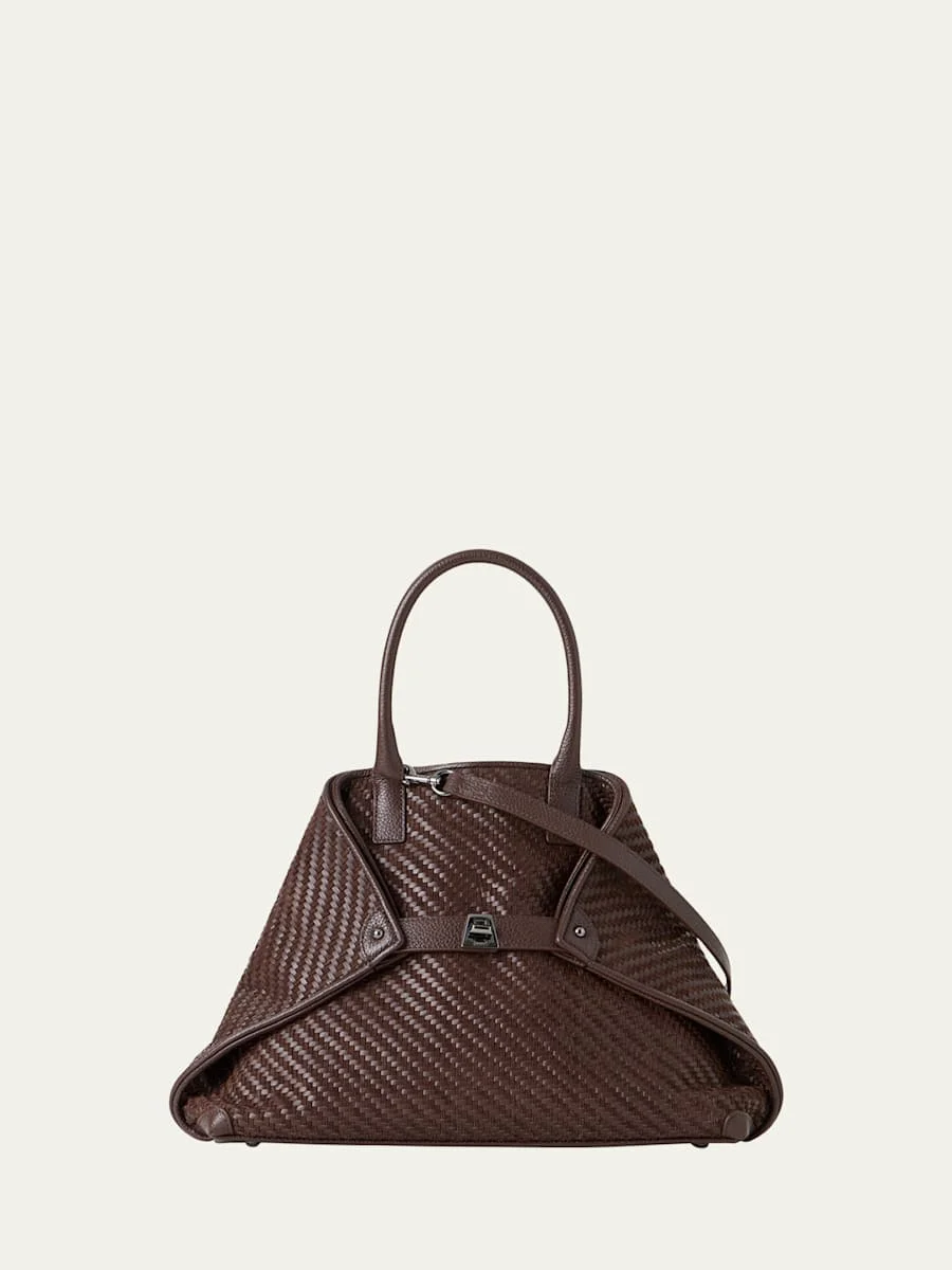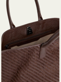 Akris small tote bag crafted in woven leather strips Rolled top handles Cinching side straps with turn-lock closure Open top with interior push closure Interior, one zip pocket Approx. 9.8"H x 15.7"W x 3.9"D Made in Romania Online Inquiries: BGS21_V6JF2| Store Inquiries: #5015796