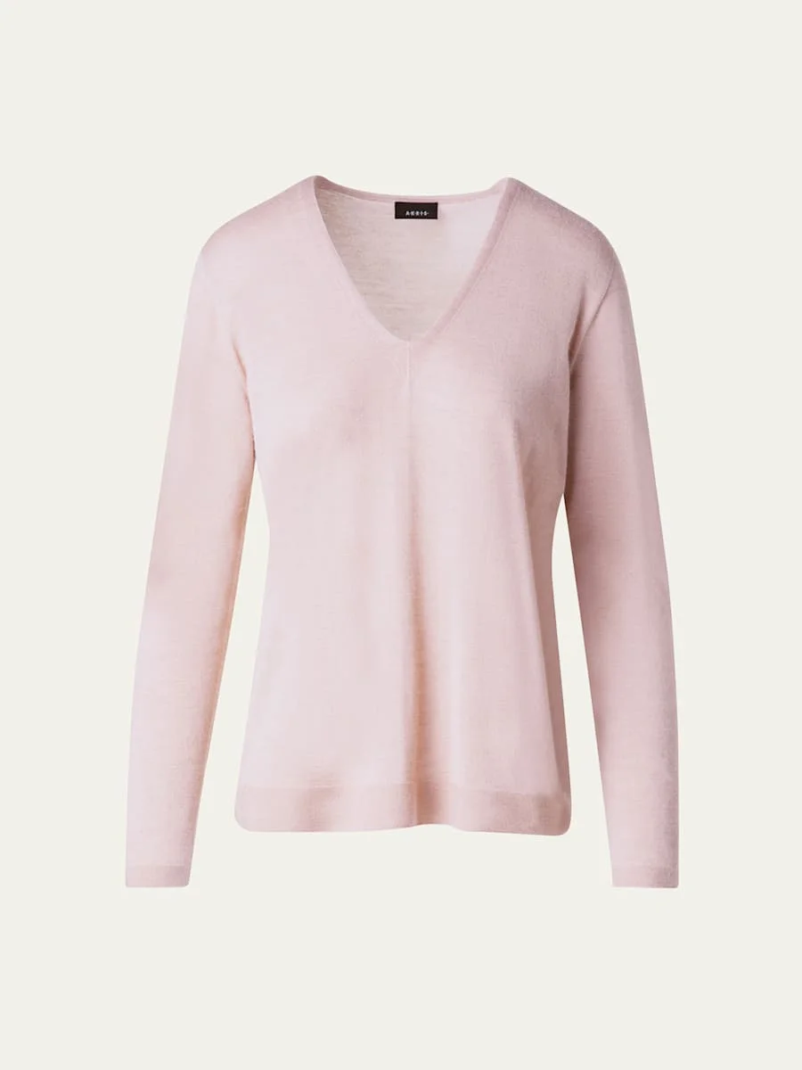 Akris knit sweater in a cashmere-silk blend V neckline Long sleeves Relaxed fit Pullover style Cashmere/silk Dry clean Made in Romania Online Inquiries: BGS21_B9QKC| Store Inquiries: #4945472
