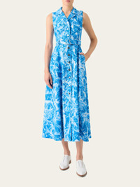 Akris shirtdress is crafted of cotton stretch denim featuring a whitecaps print and a self-belt with a signature trapezoid buckle Notch collar; button front Sleeveless Belted waist Angled hip slip pockets A-line silhouette Hem falls below the knee Cotton/elastane Lining: Viscose/elastane Dry clean Made in Romania Online Inquiries: BGS21_BATF1| Store Inquiries: #5267940