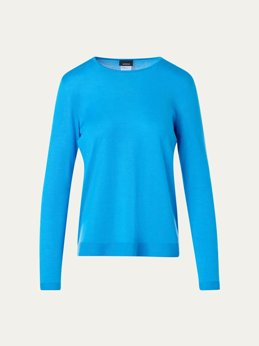 Akris blended wool knit sweater embodies minimalist style and comfort Crew neckline Long sleeves Hip length Relaxed fit Pullover style Wool/nylon/polyamide Made in Romania Online Inquiries: BGS21_BAHQM| Store Inquiries: #5157512