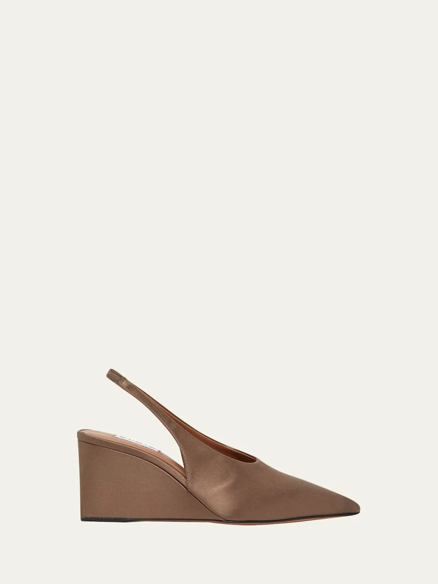 These wedges from ALAIA are crafted from lustrous satin atop a comfortable heel 3.00 in / 75 mm covered wedge heel Pointed toe Elasticized slingback strap Leather lining Leather/Rubber outsole Made in Italy