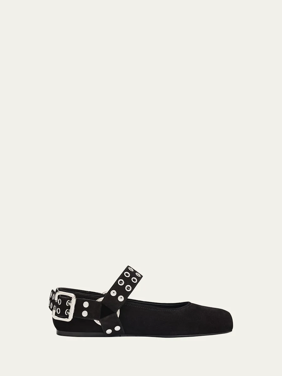 ALAIA "Biker" ballet flats in suede revved up with metal studs for a motoinspired aesthetic 0.17 in / 5 mm flat heel Square toe Buckled harnessstyle strap Leather/rubber outsole Lining: Leather Made in Italy