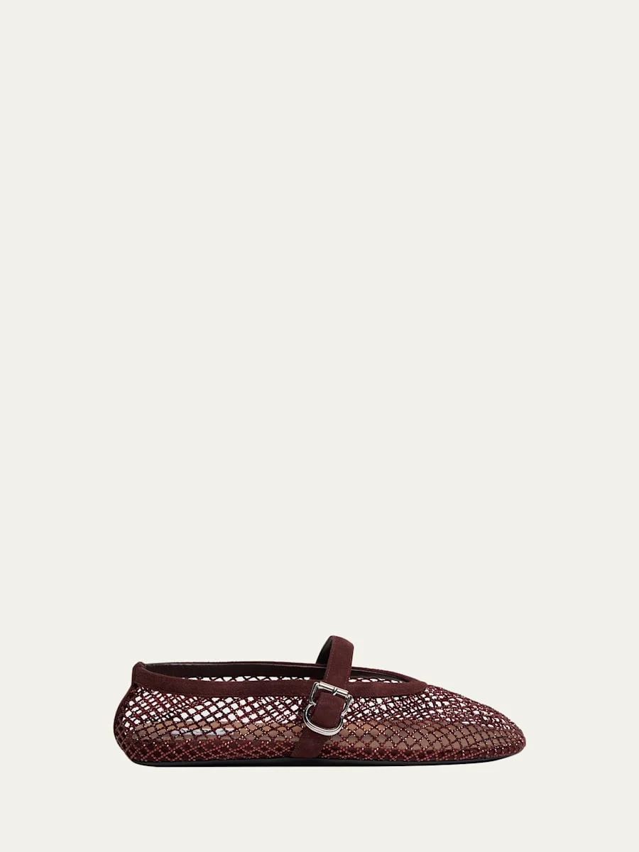 These ballet flats by ALAIA are crafted from crystalembellished mesh with tonal suede trim Flat heel Round toe Adjustable Mary Jane buckle strap Leather lining Rubber outsole Made in Italy