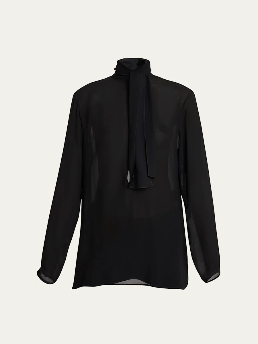 ALAIA sheer georgette blouse adorned with a scarf that can be styled in multiple ways High neckline Long sleeves; button cuffs Relaxed fit Hip length Viscose Made in Italy Online Inquiries: BGS21_BA3JR| Store Inquiries: #5025312