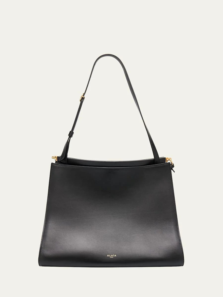 ALAIA "Le Click" curve shoulder bag in glossy calf leather Adjustable shoulder strap Open top with magnetic closure Divided compartment interior Lining: Leather Approx. 9.6"H x 13"W x 6.3"D Professional cleaning recommended Made in Italy Online Inquiries: BGS21_V6GVN| Store Inquiries: #4987628