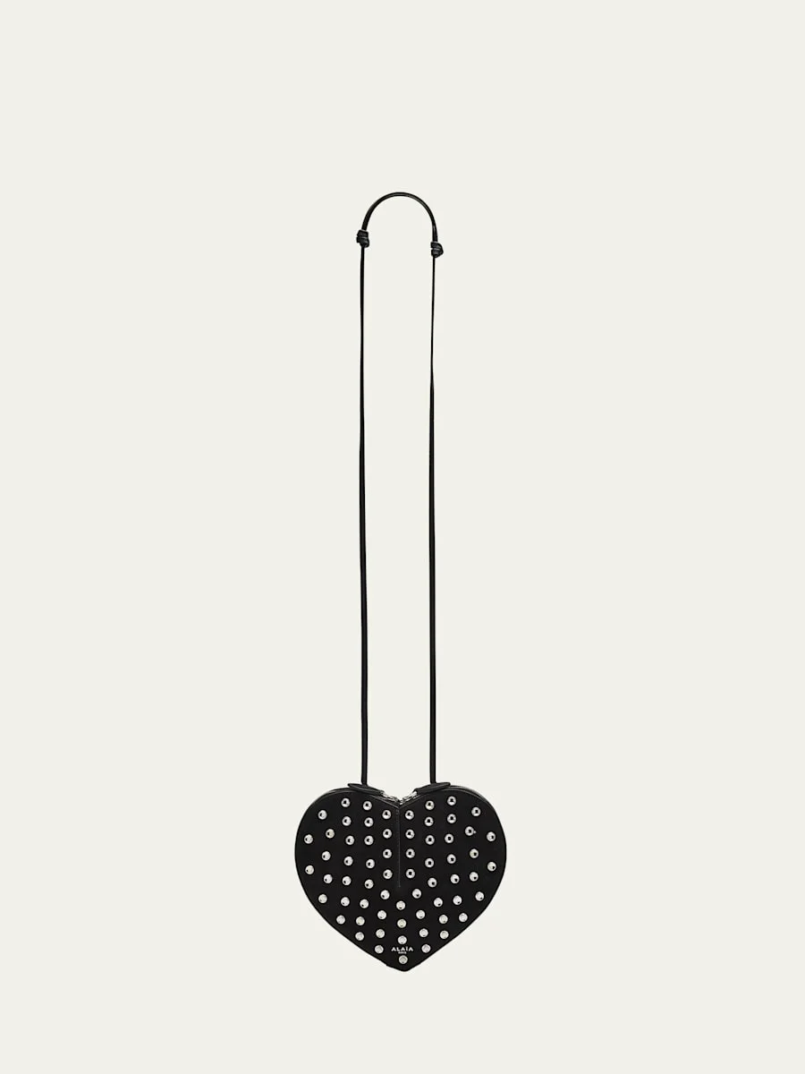 ALAIA "Le Coeur" goatskin leather crossbody bag with studs Adjustable crossbody strap Two-way zip top closure Approx. 6.7"H x 8.3"W x 2"D Made in Italy Online Inquiries: BGS21_V6GVM| Store Inquiries: #4987627