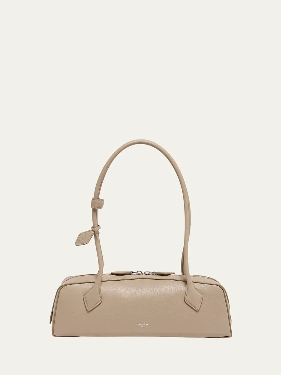ALAIA "Teckel" shoulder bag in leather Rolled shoulder straps with logo strap closure Twoway zip top closure Interior, one card slot Lining: Leather Approx. 4.3"H x 13"W x 3.9"D Professional cleaning recommended Made in Italy