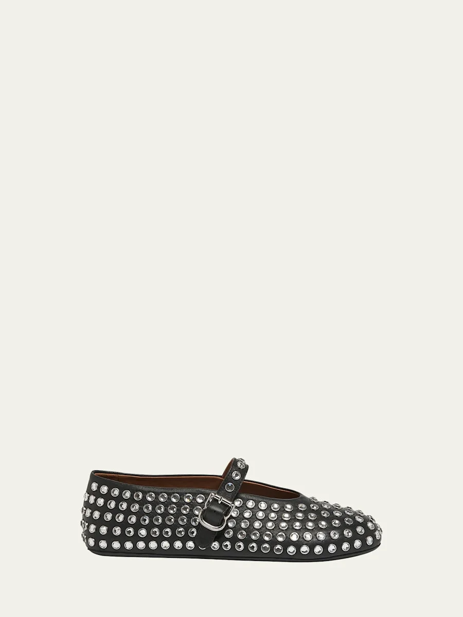 ALAIA ballet flats in lambskin leather featuring allover metal studs 0.17 in / 5 mm flat heel Buckle strap detail with snap closure Round toe Rubber outsole Made in Italy