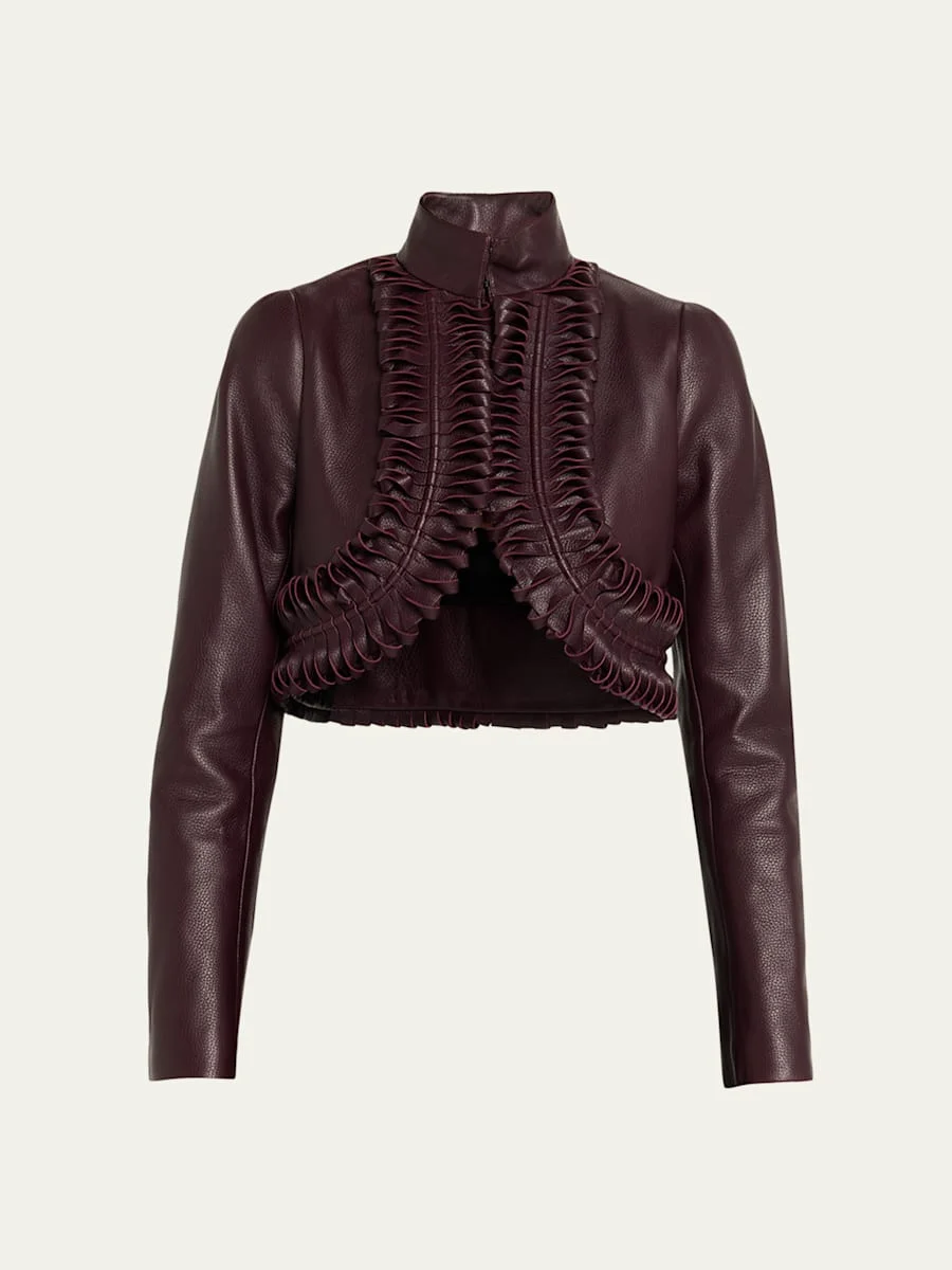 Designed with a triangular cutaway front, this grained leather jacket by ALAIA debuts with curled trimming details for added textural interest High neckline Long sleeves Cropped length Fitted Leather Lining: Cupro Made in France