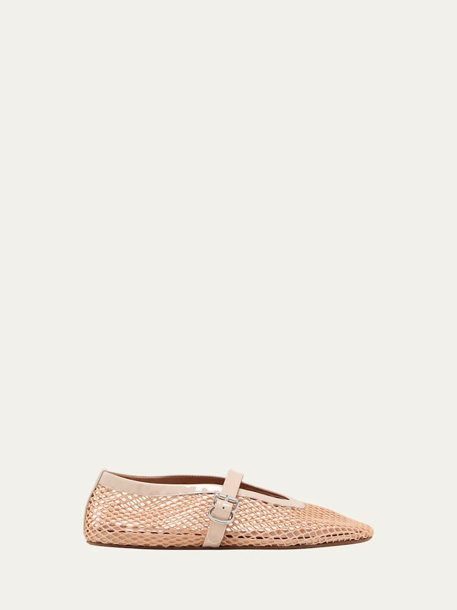 ALAIA mesh net ballerina flats with patent leather trim Round toe Adjustable Mary Jane buckle Leather/Rubber outsole Made in Italy Online Inquiries: BGS21_X6ZCN| Store Inquiries: #4218516