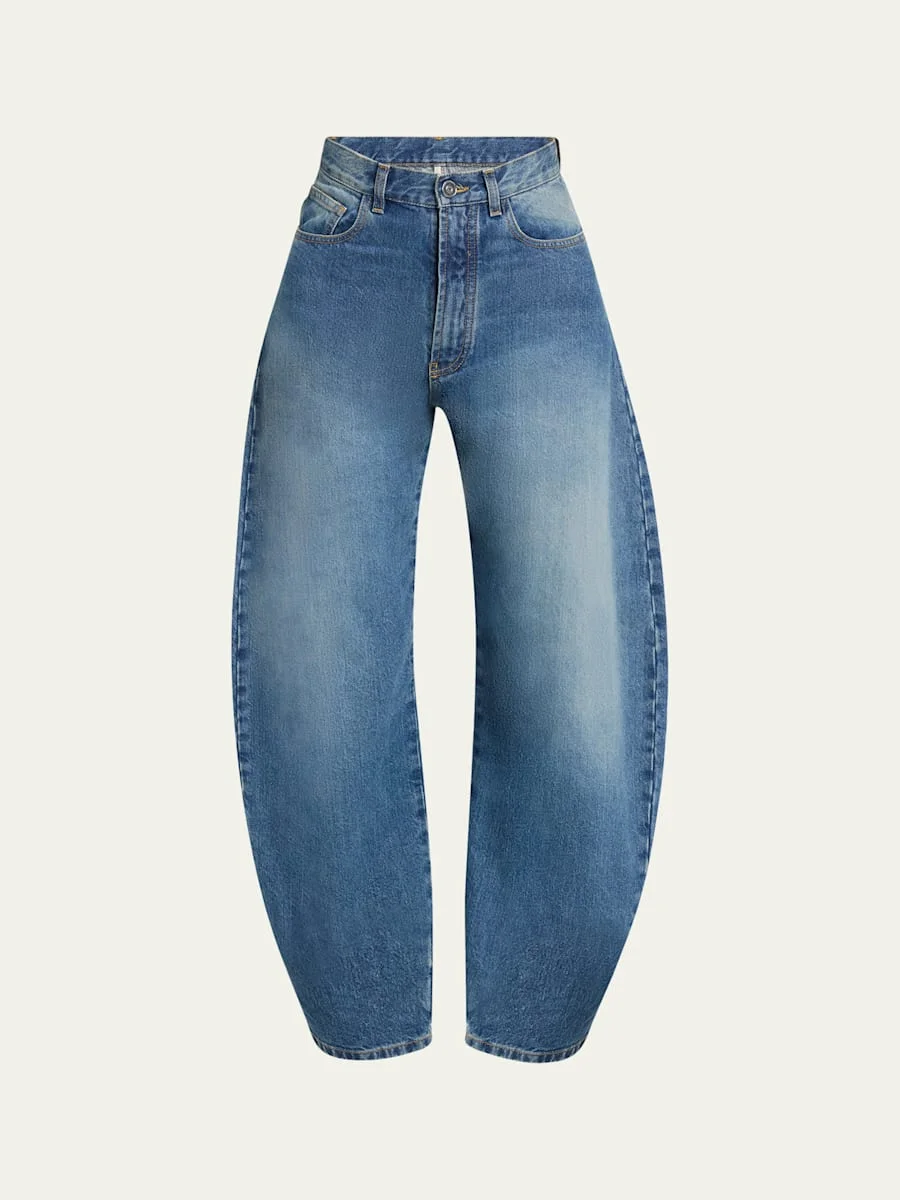 ALAIA barrel jeans in faded medium-wash denim Mid rise sits high on hip Five-pocket style Wide legs Full length Button/zip fly; belt loops Cotton/polyurethane Made in Italy Online Inquiries: BGS21_B9P37| Store Inquiries: #4931472