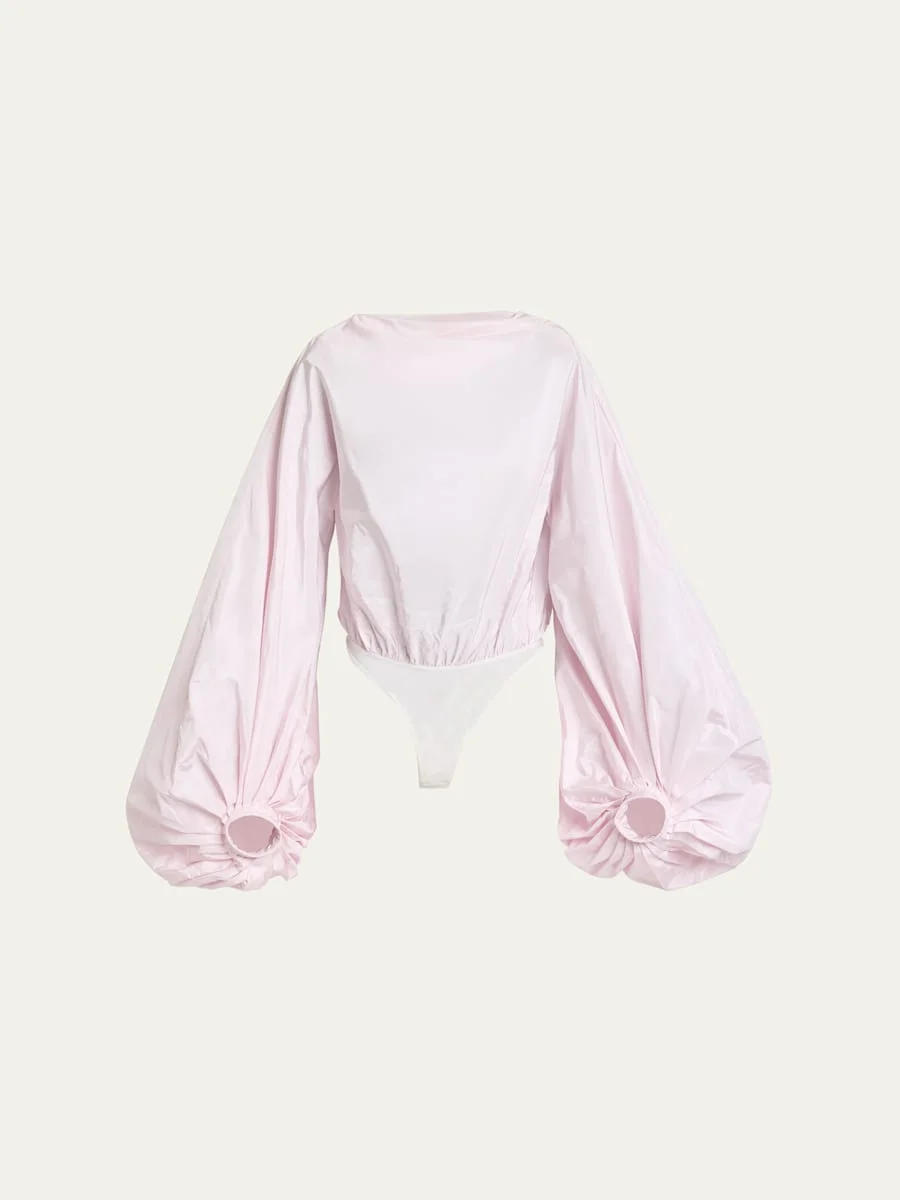 ALAIA taffeta bodysuit Bateau neckline; low-cut back Long puff sleeves Relaxed fit Minimal seat coverage Silk Dry clean Made in Italy Online Inquiries: BGS21_I2N42| Store Inquiries: #4982554