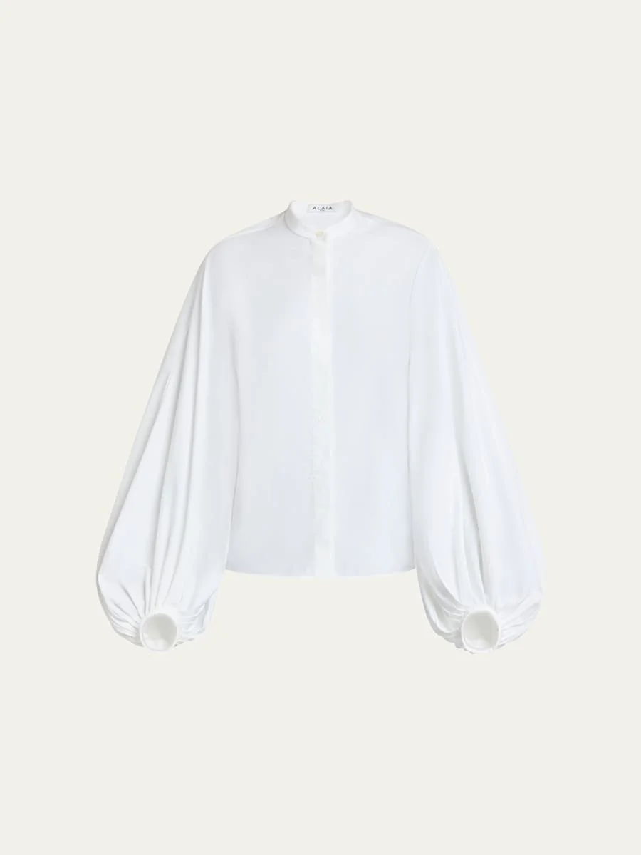 ALAIA solid blouse Band collar; button front Long puff sleeves Straight fit Cotton Dry clean Made in Italy Online Inquiries: BGS21_B9VHA| Store Inquiries: #4982552