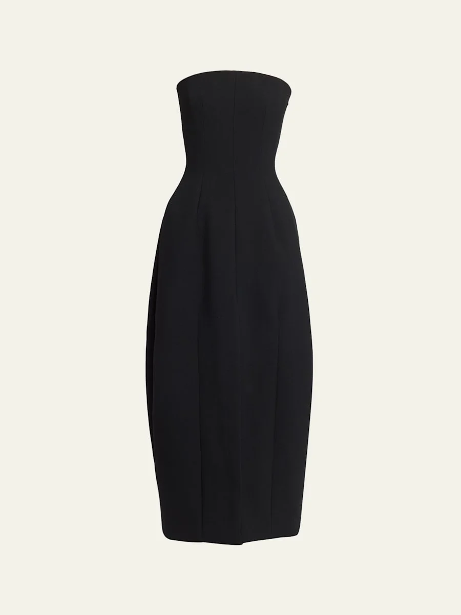 This dress by ALAIA is crafted from woolblend crepe with a corsetstyle bodice cinched in at the waist and a sheer, polkadot hem Strapless neckline Sleeveless Side seam pockets Centercut front vent Full length Invisible side zip closure Virgin wool/nylon/polyamide Made in Italy
