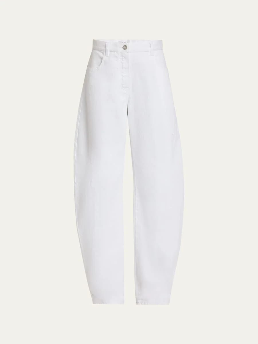 ALAIA round-leg jeans in crisp white denim High rise Four-pocket style Relaxed fit Full length Button/zip fly; belt loops Cotton Made in Italy Online Inquiries: BGS21_BA3J6| Store Inquiries: #5025290