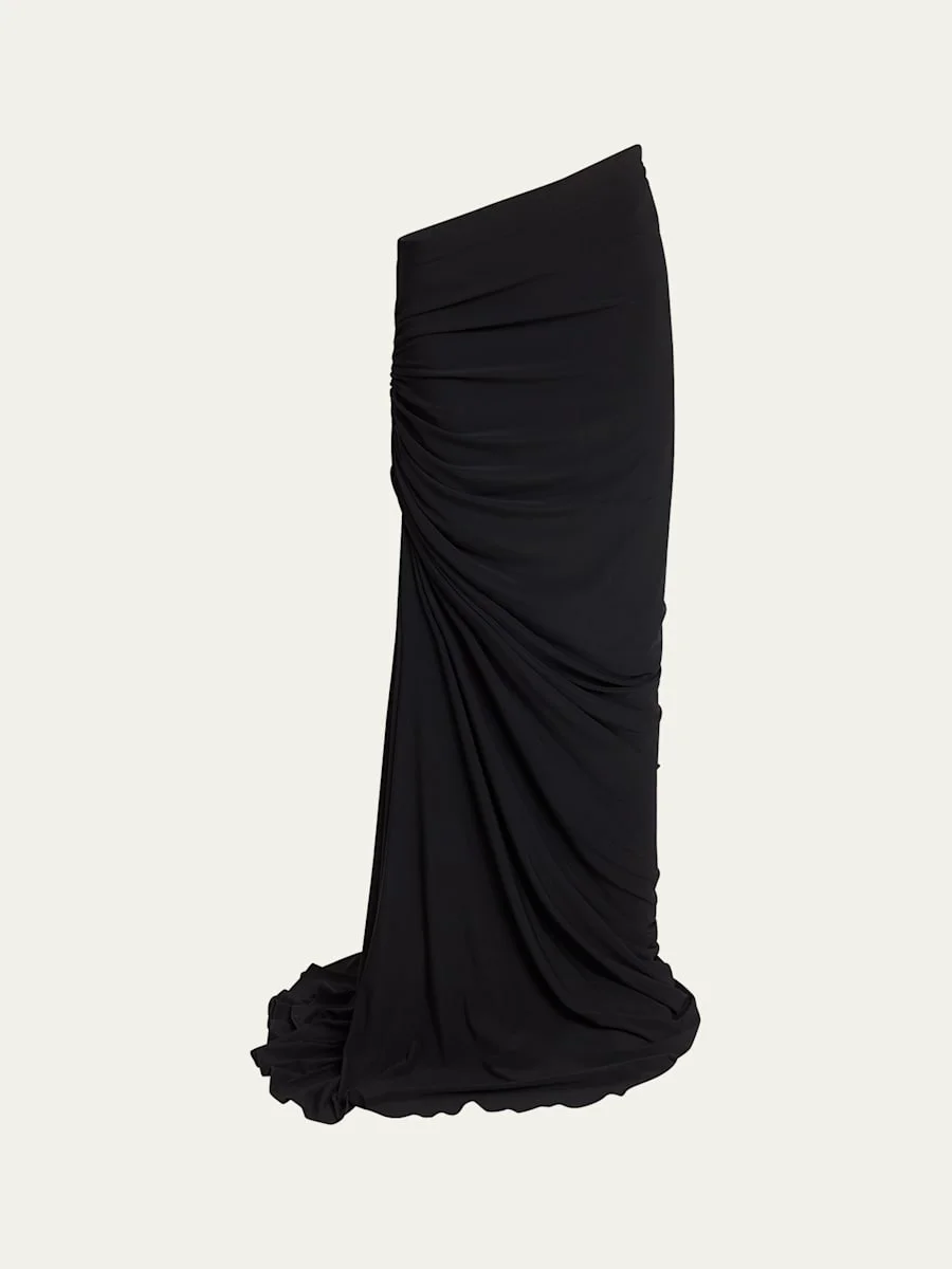 ALAIA skirt accented with a flattering ruched side detail High rise Draped silhouette Full length Slip-on style Viscose/elastane Made in France Online Inquiries: BGS21_BA392| Store Inquiries: #5024096