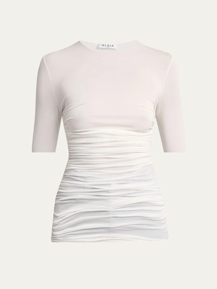 ALAIA ruched jersey top Crew neckline Short sleeves Fitted Hem sits at the hip Pullover style Viscose/elastane Made in Italy