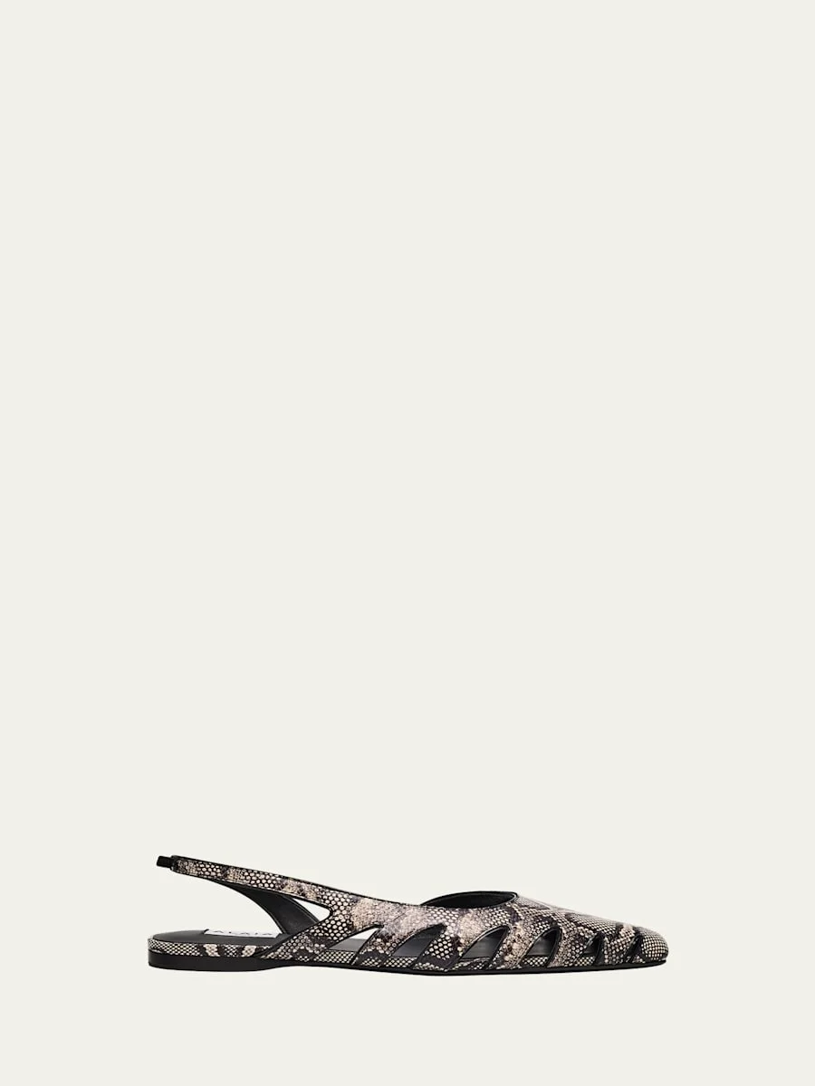 Crafted from bold snakeskin trimmed with smooth calf leather, these ballerina flats by ALAIA feature side cutout detailing Flat heel Pointed toe Elastic slingback strap Leather lining and outsole Made in Italy Online Inquiries: BGS21_X6ZML| Store Inquiries: #5073121
