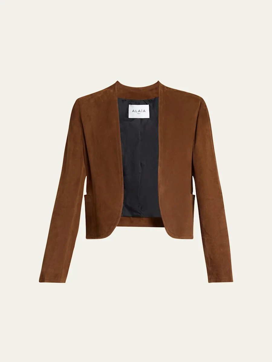 ALAIA blazer jacket in calf suede Open front (no closure) Long sleeves Front slip pockets Relaxed fit Hip length Made in France