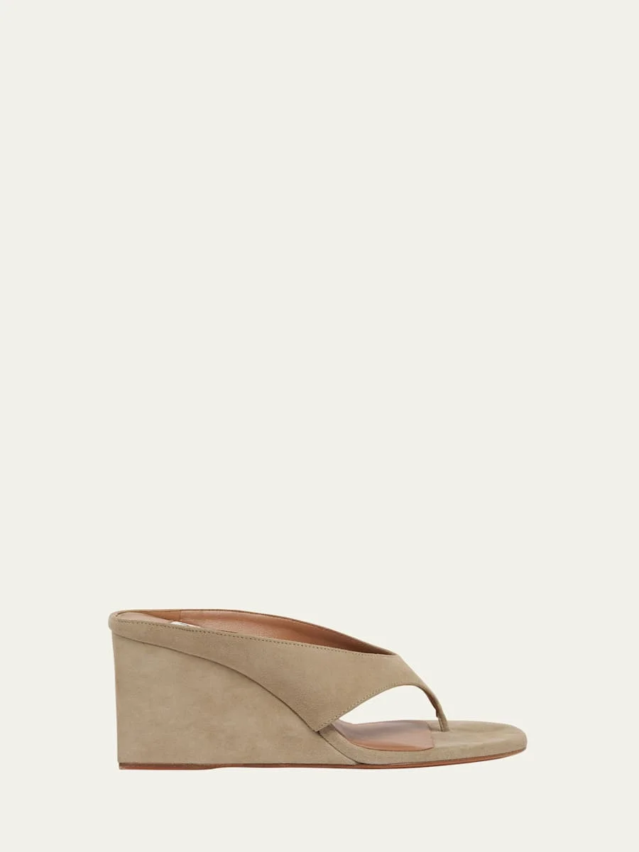 ALAIA suede sandals 3.00 in / 75 mm wedge heel Open toe Thong strap Slip-on style Leather/Rubber outsole Lining: Leather Made in Italy Online Inquiries: BGS21_X6XAE| Store Inquiries: #5033635