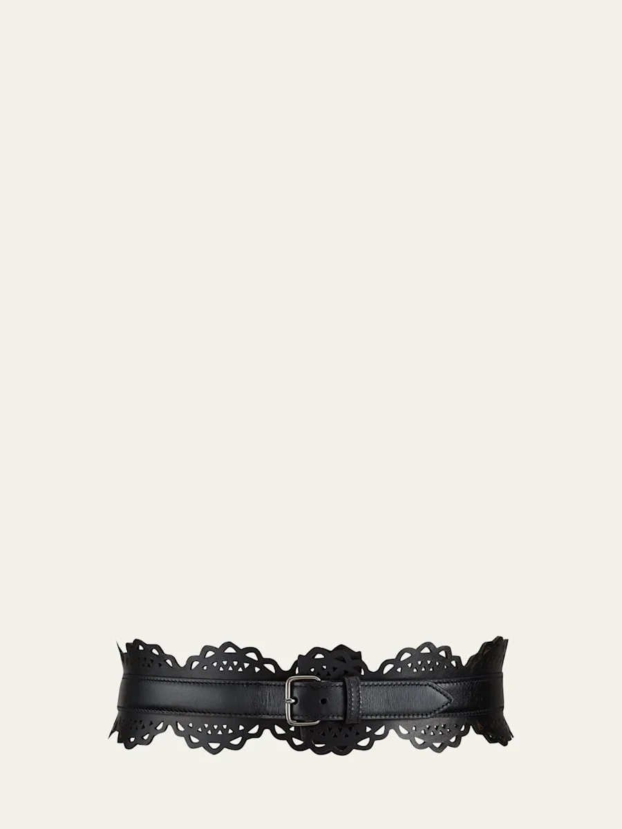 ALAÏA calfskin leather thin corset belt. Laser-cut like lace. Scalloped edges. Lambskin, lining. Made in Italy. Online Inquiries: BGS21_D3UGZ| Store Inquiries: #3670024