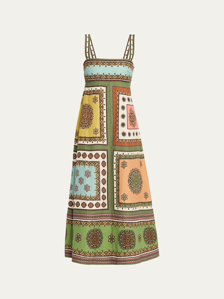 Cut from a linen blend fabric in a multipattern print, the "Contini" day dress by ALEMAIS features a fitted bust and an empire waist Square neckline Sleeveless Hem falls below the knee Aline silhouette Shirred back panel Invisible side zipper Viscose/linen Dry clean Imported