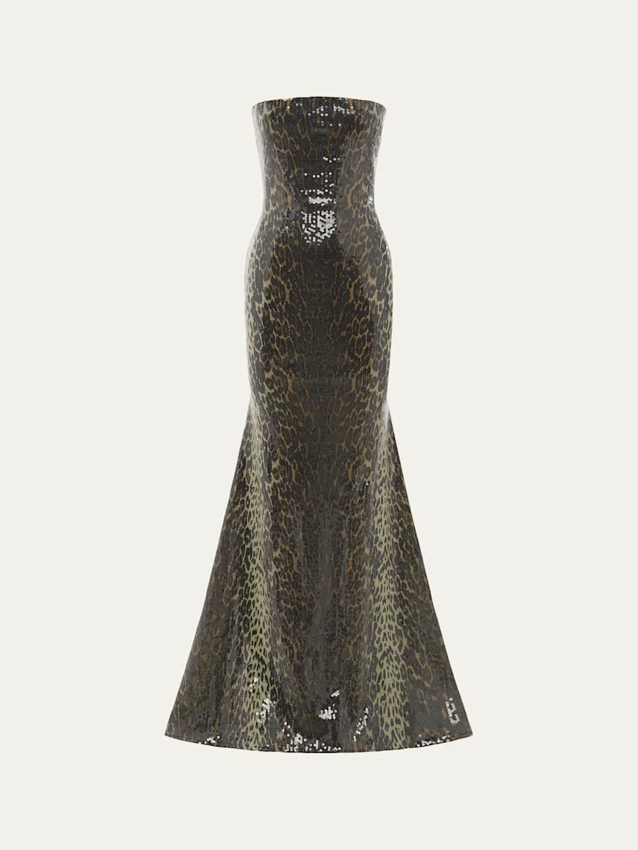 Strapless Leopard-Print Sequined Longline Trumpet Gown