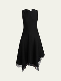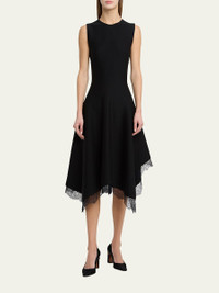 McQueen knit dress featuring an asymmetric hem embellished with lace Round neckline Sleeveless Fit-and-flare silhouette Hem falls below the knee Back zip Wool/nylon/polyamide/viscose Made in Italy Online Inquiries: BGS21_BA7RM| Store Inquiries: #5046797