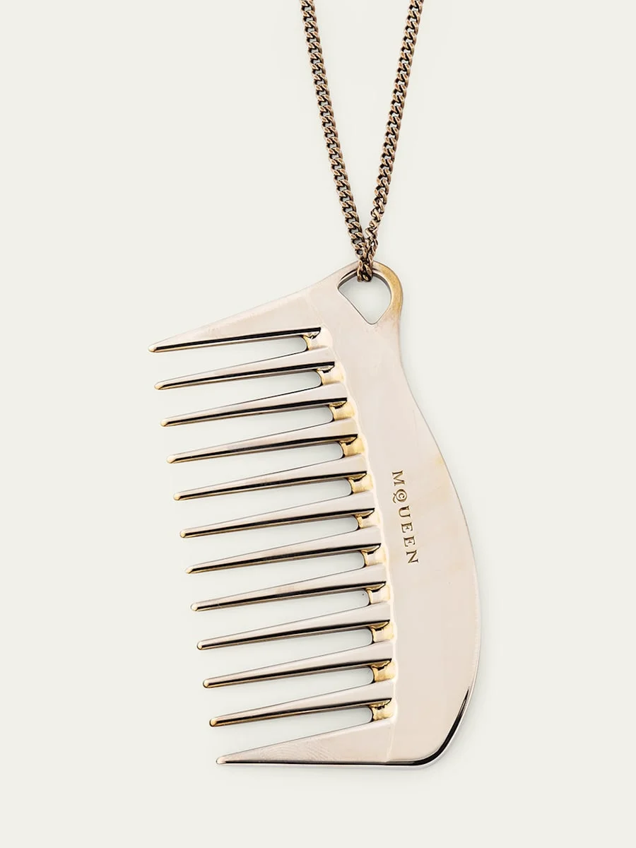 A comblike pendant hangs on this McQueen necklace. The brand's logo is embossed on the shiny comb. Brass chain and hardware Adjustable length Lobster clasp Made in Italy
