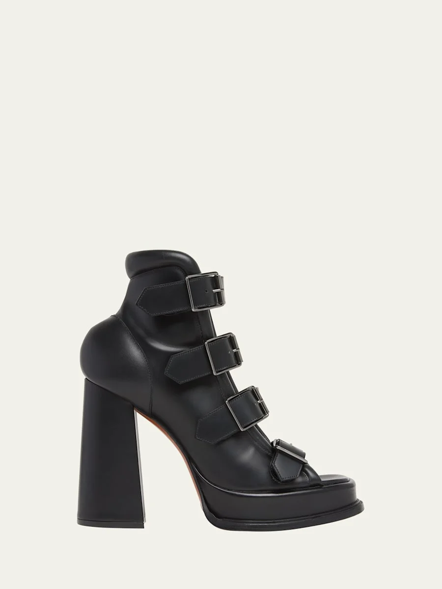 McQueen platform sandals in calf leather 4.75 in / 120 mm block heel; 1.00 in / 25 mm platform Round peep toe Leather outsole Four buckle strap vamp Lining: Leather Professional cleaning recommended Made in Italy Online Inquiries: BGS21_X6V0F| Store Inquiries: #4984708