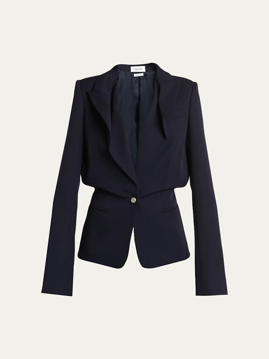 Crafted from grain de poudre wool, this cinched jacket from McQueen is sealed by a single front button. Peak lapels Long sleeves; button cuffs Chest welt pocket Side jetted pockets Single button fastening Cinched silhouette Wool Dry clean Made in Italy SIZE amp; FITModel measurements: 5'10" tall Model is wearing a US size 4/Small