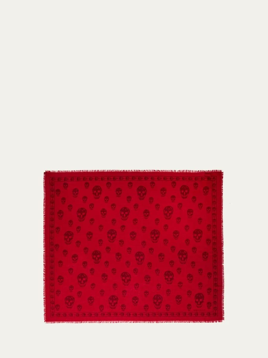 McQueen scarf in classic skull pattern wool Approx. 47.2"L x 40.9"W Eyelash fringe trim Can be worn multiple ways Dry clean Made in Italy