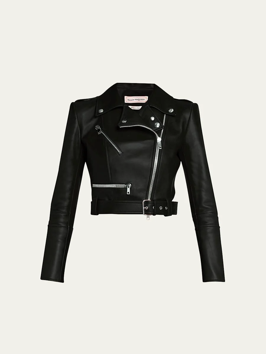 Alexander McQueen cropped biker jacket in lambskin leather Notched collar Asymmetric zip front Long sleeves; zipper vents Front zip pockets Belted waist Fitted silhouette Lambskin leather Lining: Viscose Made in Italy Model is 5'10"/177cm. Online Inquiries: BGS21_B85C9| Store Inquiries: #4474547