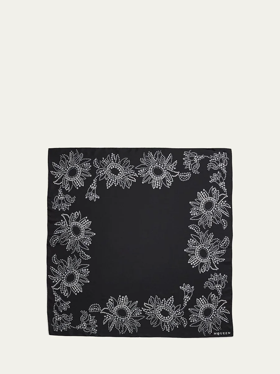 This beautiful McQueen scarf is detailed with an "exploded sunflower" motif around the border in crystals. Can be styled in multiple ways Approx. 36"Sq. Silk Dry clean Made in Italy Online Inquiries: BGS21_D5GKF| Store Inquiries: #5369356