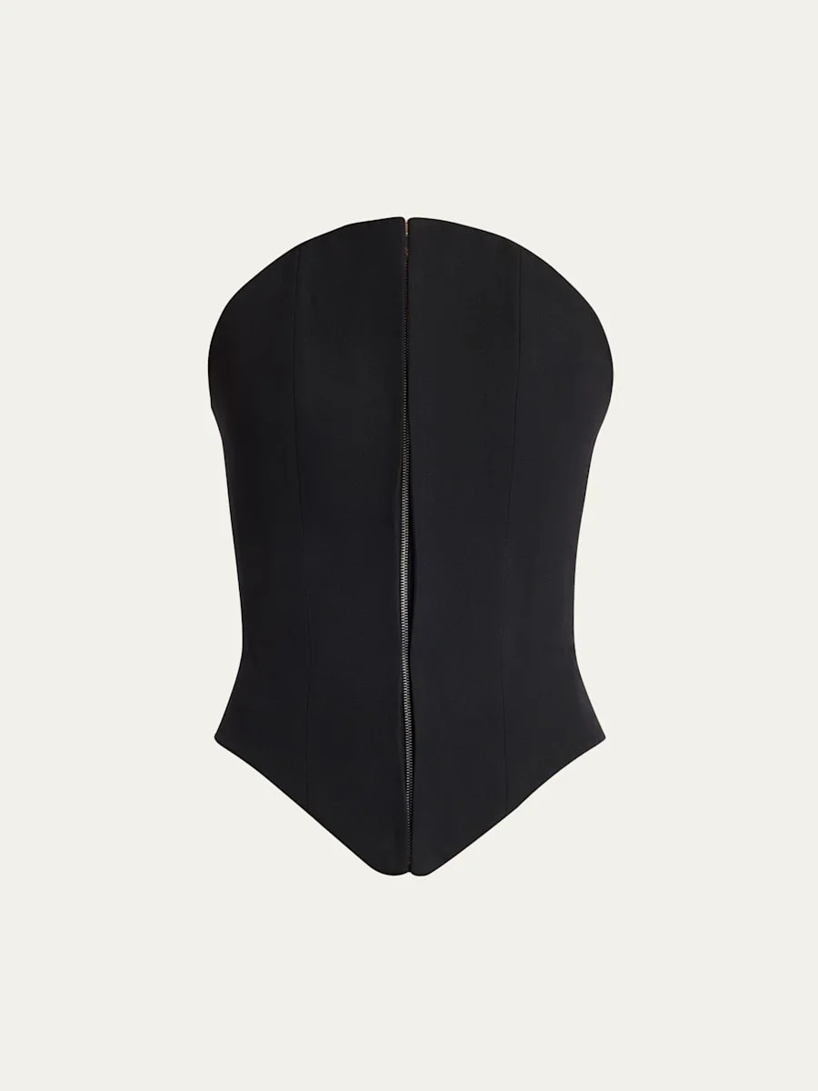 Alexander McQueen bustier top featuring a curved neckline and a pointed hem Strapless neckline Sleeveless Fitted Front zip Wool Dry clean Made in Italy Model is 5'10"/177cm. Online Inquiries: BGS21_B9P2J| Store Inquiries: #4931369