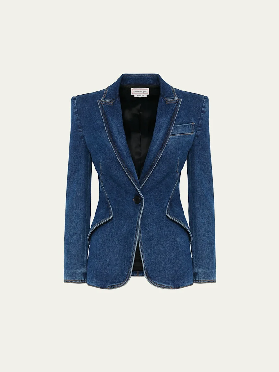 Alexander McQueen denim blazer Peak lapels; one-button front Long sleeves; button cuffs Chest welt pockets; hip flap pockets Classic fit Double-vented back Cotton/elastane Made in Italy Model is 5'10"/177cm. Online Inquiries: BGS21_B8KYT| Store Inquiries: #4589364
