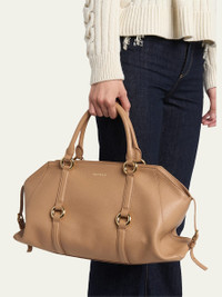 Angular lines, eyecatching metallic rings, and a versatile shape define this McQueen "Farringdon" tophandle bag, crafted in grainy calf leather with belt straps inspired by the house's iconic harness detailing. This shoulder bag made its debut on the AutumnWinter 2025 runway. Named after the historic location of the McQueen design studio Rolled top handles Detachable, adjustable shoulder strap Can be worn as a top handle or shoulder bag Zip top closure Adjustable side buckle straps Interior, one slip pocket Approx. 10.2"H x 17.7"W x 4.3"D Made in Italy