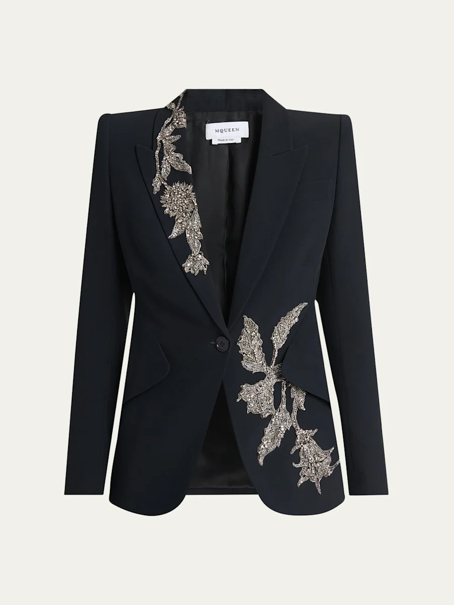 McQueen leaf crepe blazer showcases floral crystal embroidery Peak lapels; single button fastening Long sleeves; button cuffs Structured shoulders Chest welt pocket; waist flap pockets Fitted Double-vented back Viscose/acetate Dry clean Made in Italy Online Inquiries: BGS21_B9WDN| Store Inquiries: #4987079