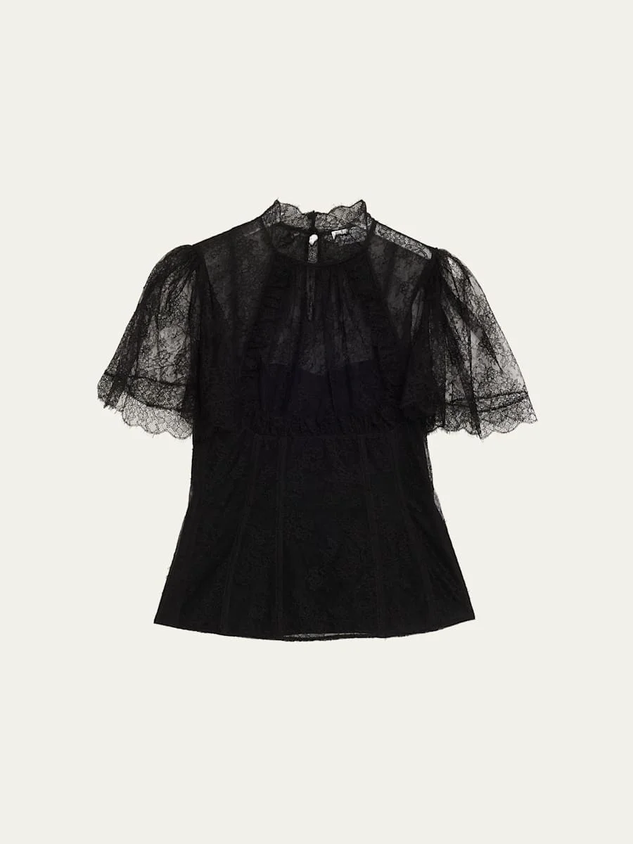 Crafted from delicate floral lace, this alluring top from McQueen features a gathered bustier yoke, slimming waist darts, and flutter sleeves with eyelash scalloped edges Band collar; button/keyhole back Short flutter sleeves Slim fit Hip length Pullover style Polyamide/viscose Dry clean Made in Italy SIZE amp; FITModel measurements: 5'10" tall Model is wearing a US size 4/Small