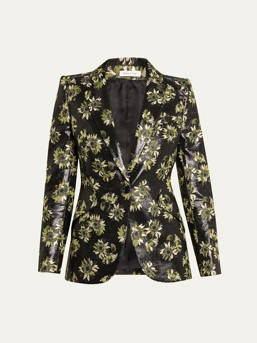 McQueen statement jacket cut from richly-hued Sunflower jacquard Peak lapels Long sleeves Chest welt pocket Side flap pockets T-Bar chain back detail Cutaway hem Tailored fit Single-breasted closure Cotton Made in Italy Online Inquiries: BGS21_BAM8B| Store Inquiries: #5193566