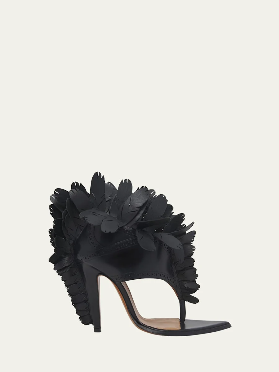 McQueen perforated leather sandals with laser-cut feather accents 4.75 in / 120 mm stiletto heel Ponited open thong toe Slip-on style Leather outsole Lining: Leather Professional cleaning recommended Made in Italy Online Inquiries: BGS21_X6V0E| Store Inquiries: #4984707