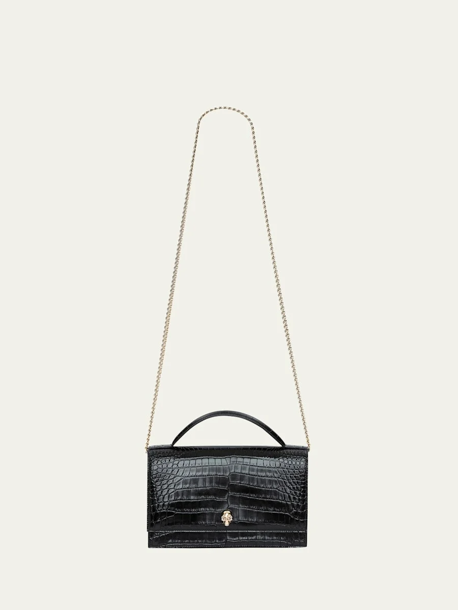 McQueen top handle bag in crocembossed calf leather Features signature skull Flat top handle Detachable chain crossbody strap Can be worn as a top handle or crossbody bag Flap top with magnetic closure Exterior, back slip pocket Interior, one card slot Approx. 9.3"H x 7.9"W x 2.4"D Made in Italy