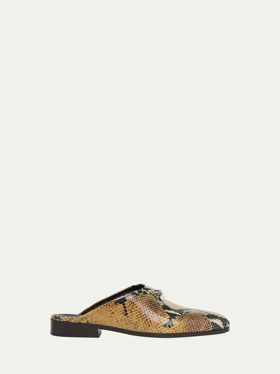 McQueen mules in snake-printed leather showcasing branded silvertone metal bar hardware Stacked heel Round toe Easy slide style Made in Italy Online Inquiries: BGS21_NDHUD| Store Inquiries: #5041029