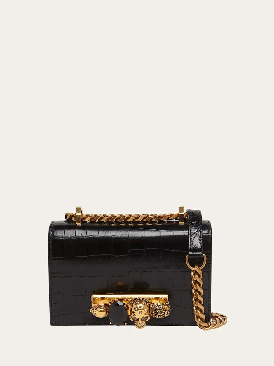 Alexander McQueen crocodile-stamped leather satchel bag. Chain and flat shoulder strap. Signature skull and jewel detail. Flap top with snap-lock closure. Interior, slip pocket. Imported. Online Inquiries: BGS21_V4PGE| Store Inquiries: #3561503