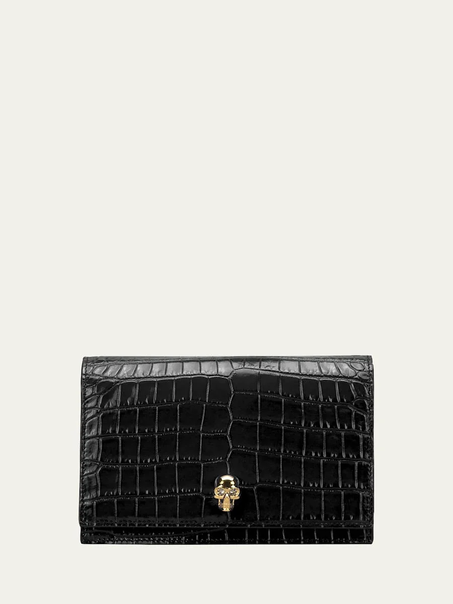 Alexander McQueen shoulder bag in croc-embossed calf leather. Curb-link shoulder chain. 3/4-flap top with signature skull. 4.9"H x 7.5"W x 2"D. Made in Italy. Online Inquiries: BGS21_V5BE4| Store Inquiries: #3426892