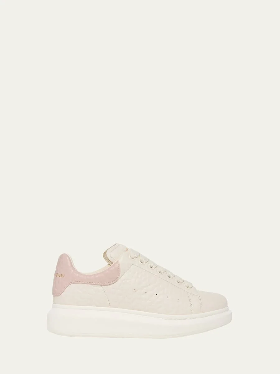 A statement silhouette from McQueen, these oversized sneakers are punctuated with contrasting pebbled leather trim, striking a balance of street and sophistication 1.50 in / 40 mm no flatform heel Round toe Lace-up vamp Large flat laces McQueen signature on the tongue and heel counter Perforated sides Contrast heel counter Oversized rubber sole Runs small, order one size up Made in Italy Online Inquiries: BGS21_X7BMK| Store Inquiries: #5363213