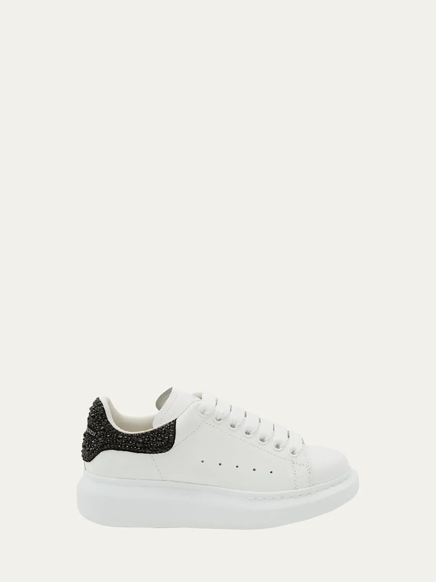 McQueen leather lowtop court sneakers with glitter heel counter. Finished with an McQueen signature on tongue and heel counter Chunky flat heel. Round toe. Perforated sides. Laceup front. Rubber sole. Runs small, order one size up. Made in Italy.