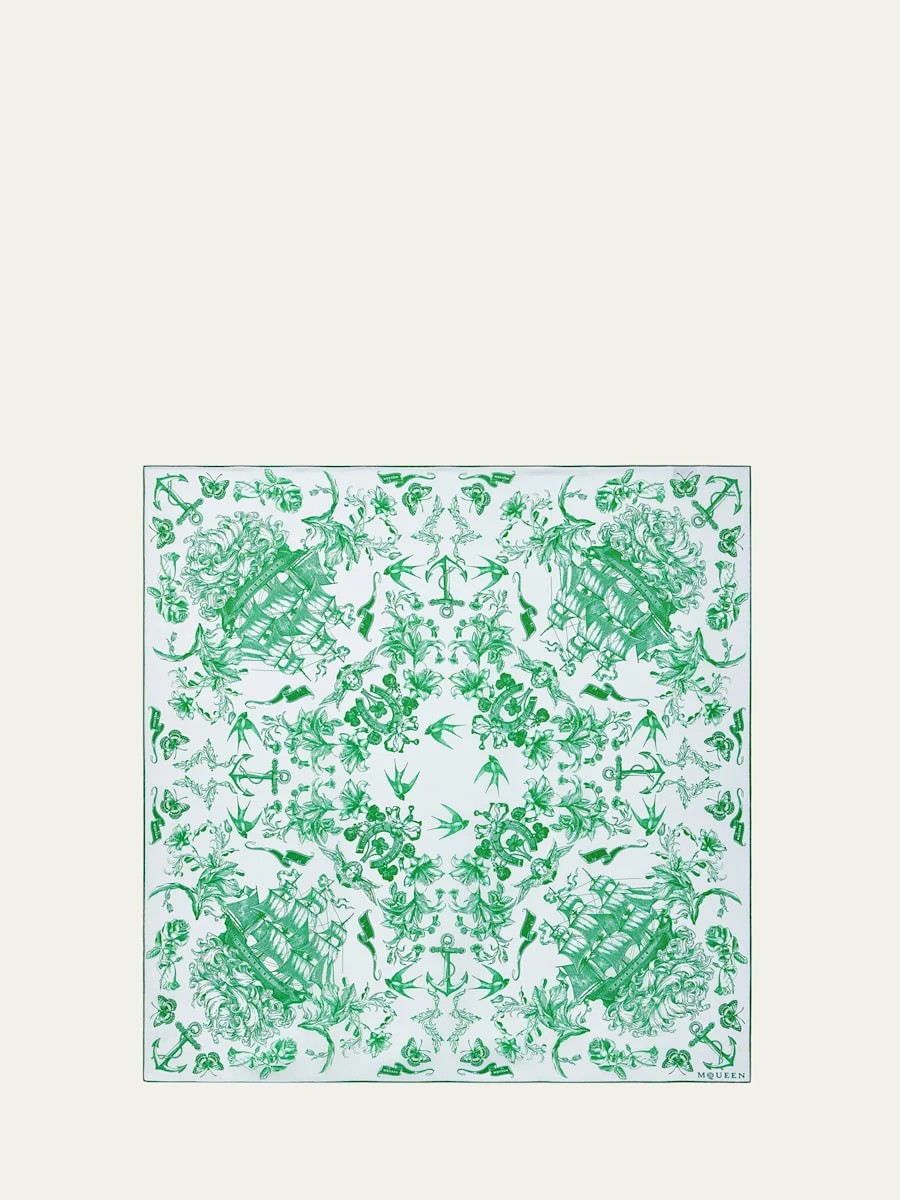 Alexander McQueen silk foulard patterned in a symmetrical sailor tattoo print, finished with rolled edges and a signature logo. Approx. 35.4"Sq. Silk Dry clean Made in Italy