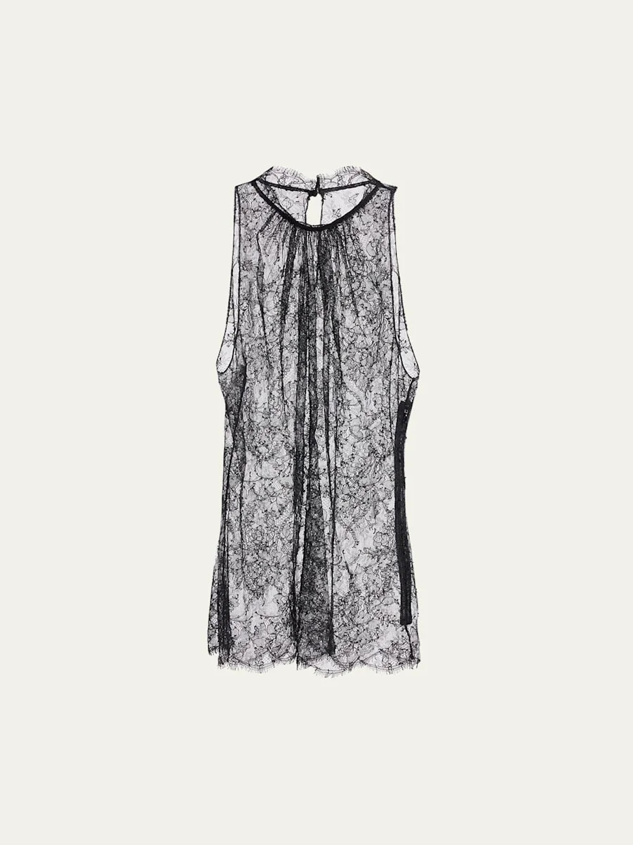 This sheer McQueen top is crafted in intricate floral lace, finished with scalloped eyelash edges on the neckline and hem Halter mock neckline Sleeveless Slim fit Keyhole button back Nylon/polyamide/viscose Made in Italy Online Inquiries: BGS21_BB004| Store Inquiries: #5362227